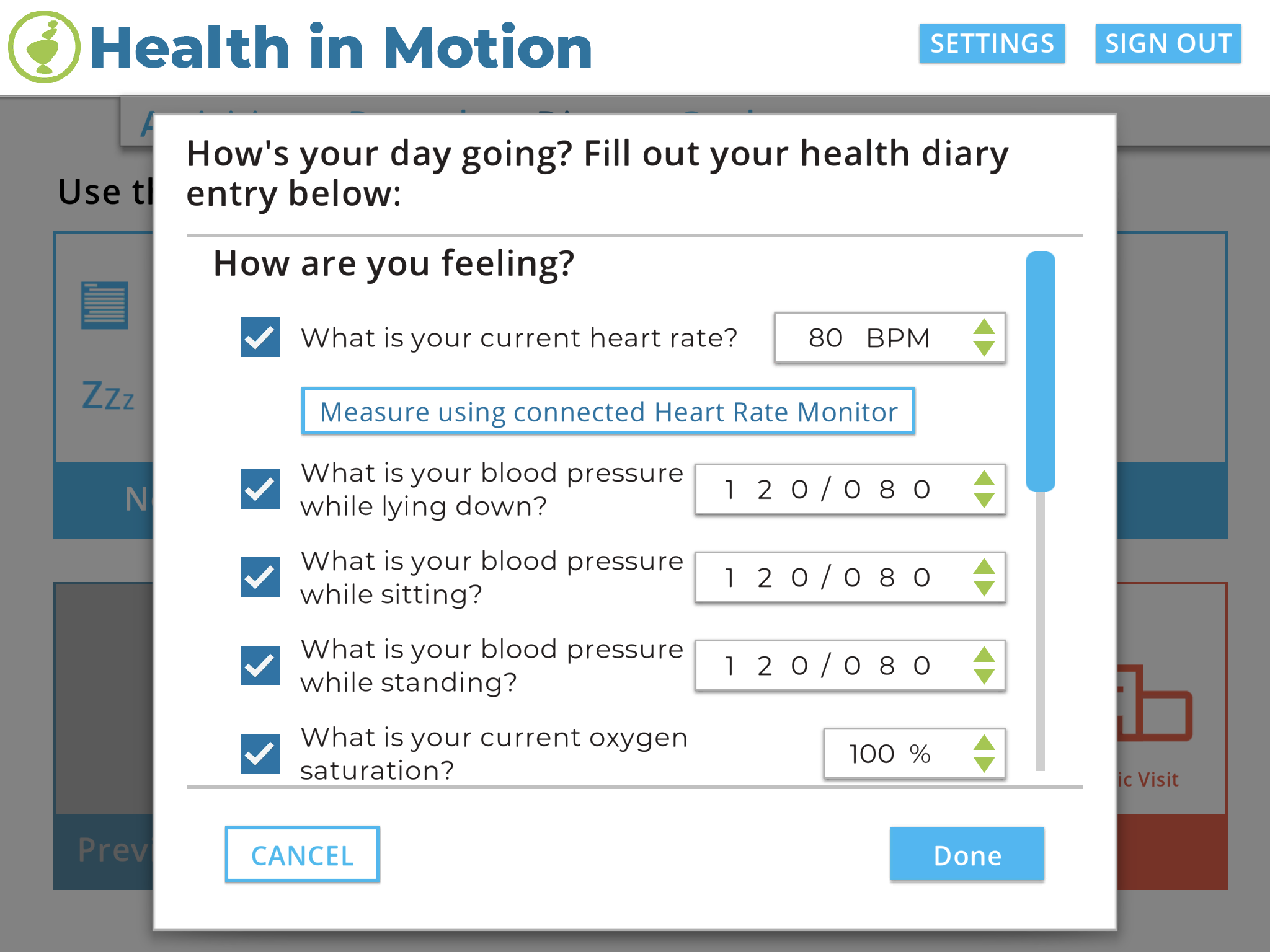 Health in Motion lets clinicians monitor your health and exercise progress in real time. You can even report health events to quickly inform your clinician of any issues you are having.