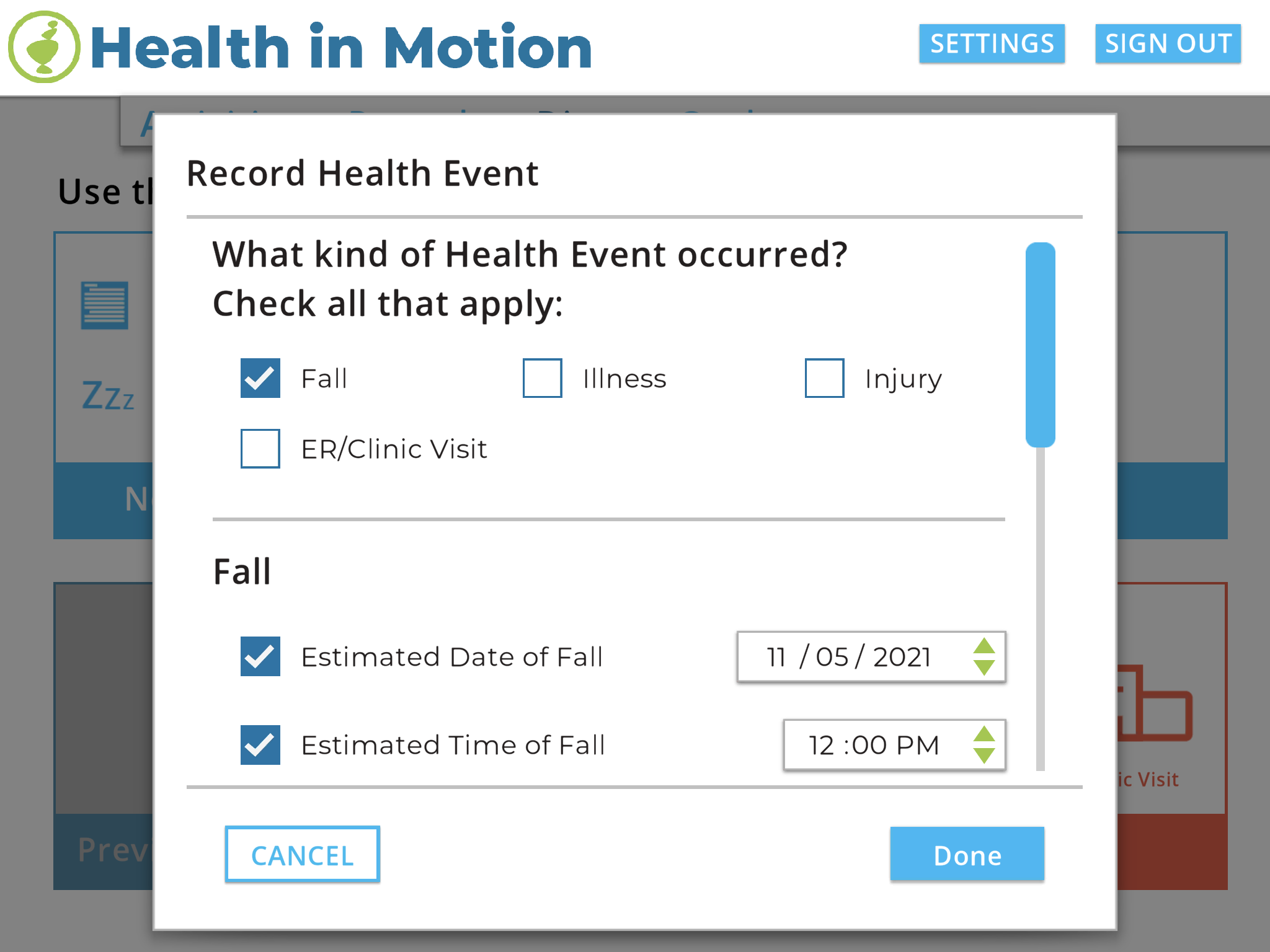 Report falls, illnesses, injuries, and ER visits to your clinician all through the app, so they can be informed as quickly as possible.